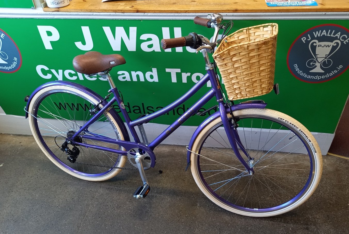 comes with mudguards stand and a wicker style basket